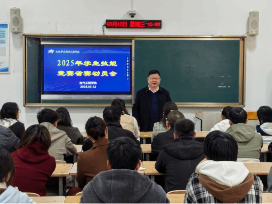 为深入贯彻落实现代职业教育体系建设改革战略部署和学校教学工作推进会精神,全力备战2025年世界职业院校技能大赛省赛,电气工程学院于3月12日召开2025年学生技能竞赛省赛动员会。电气工程学院副院长宋永兴主持会议并作动员讲话,大赛指导教师及参赛学生参加会议。