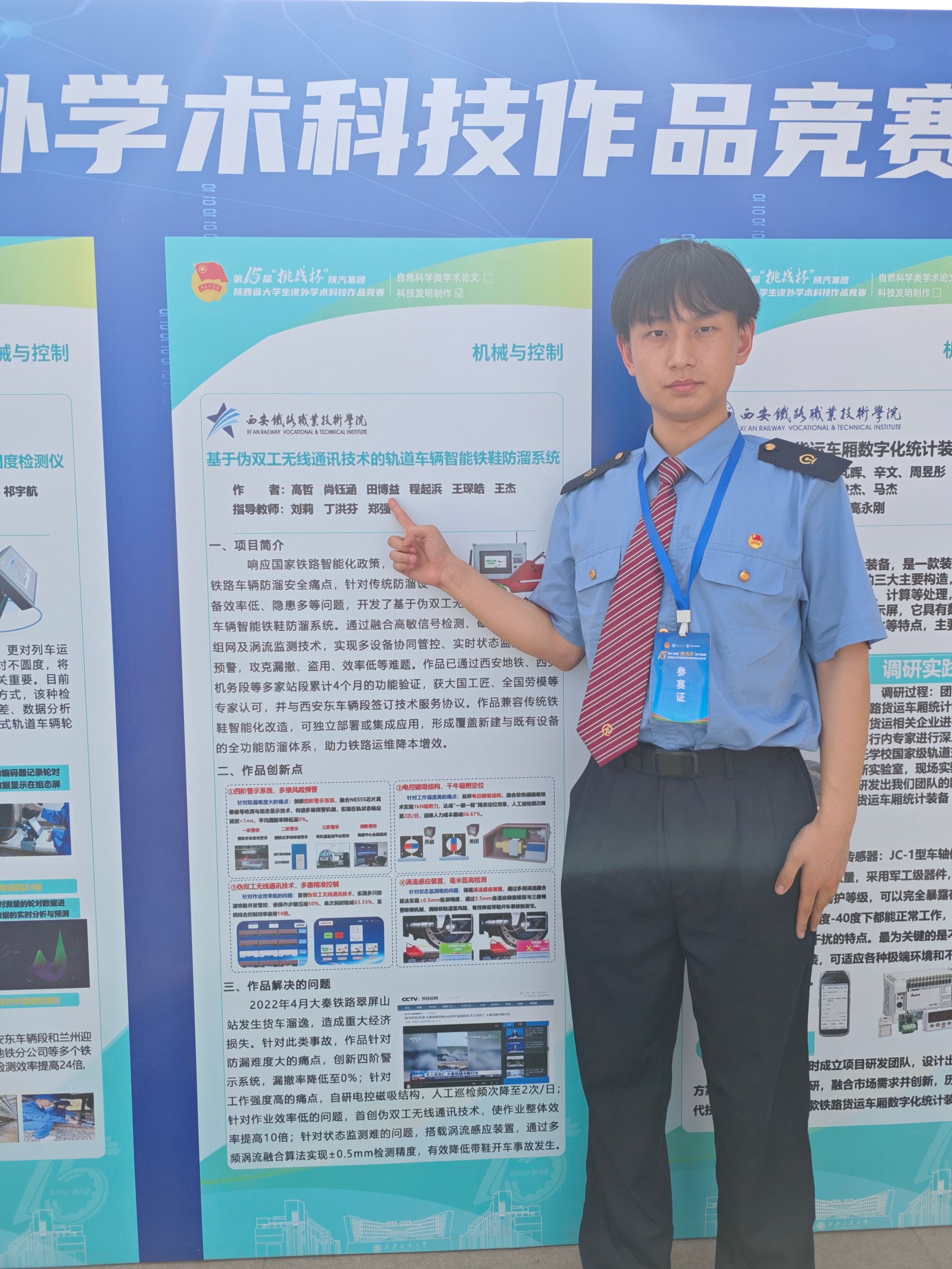 创新创业工作室负责人史骏带领机电工程学院创新工作室6支学生团队携“轴温先锋——铁路货车实时高精度轴温监测系统”,“高精度自适应地铁智能调控防汛‘墙’”,“基于伪双工无线通讯技术的轨道车辆智能铁鞋防溜系统”,“相位延时算法赋能铁路货车装载状态自适应高精度动态检测设备”,“基于多元传感的轨道交通作业智能综合防护系统”,“AI算法赋能高精度便携式轨道车辆轮对不圆度检测仪”,等6项作品参加本次决赛。