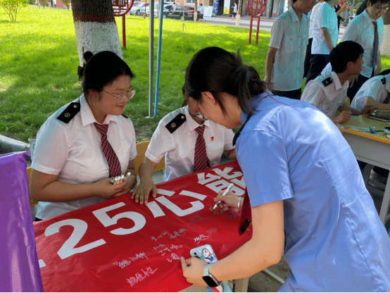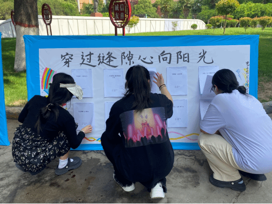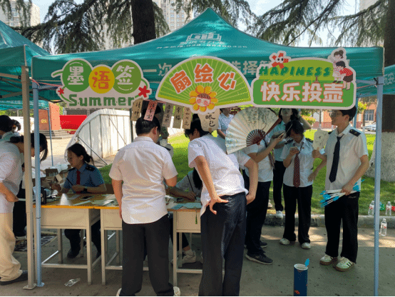 心灵创意坊则成为情感表达的“心灵港湾”。在“墨语签”区域,同学们提笔书写励志箴言,将书签悬挂于展架共享温暖;“扇绘心”活动中,素色团扇被绘上笑脸、爱心等图案,成为独特的艺术纪念品;“串起心连心”手链制作区,同学们专注编织,用色彩缤纷的珠子串联起对生活的热爱;涂色娃娃手绘区,通过颜色的搭配与手指间的勾勒,不仅展现了艺术之美,更释放了心灵压力。活动尾声,师生们纷纷在“5·25心理健康日”主题横幅上签名,共同承诺关注心理健康,营造积极向上的校园氛围。