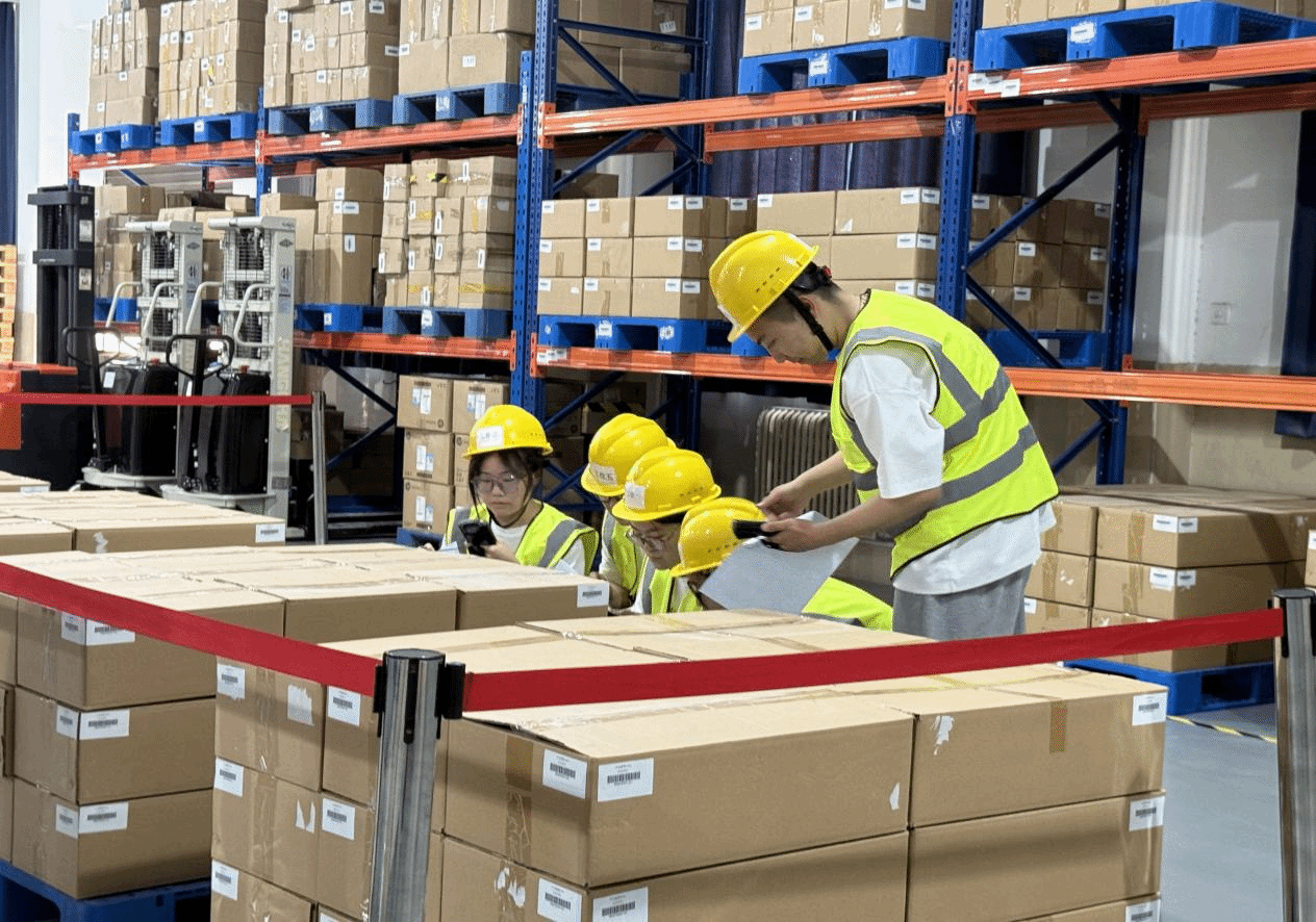 下午13点,线下实操考核在智慧物流实训中心进行,学生戴安全帽、身着荧光衣,手持终端单独完成入库、出库、录单等多项物流作业。