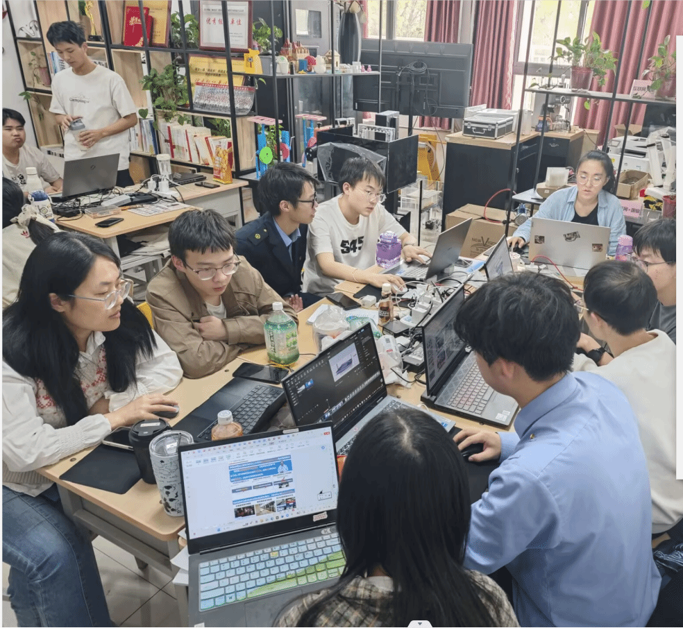 同时,机电工程学院15名教师与81名学生积极备赛2025年中国国际大学生创新大赛省赛、全国大学生电子设计竞赛和中国大学生机械工程创新创意大赛。清晨七点的校园尚在晨曦中沉睡,机电工程学院创新工作室的灯光已率先点亮,调试代码的键盘敲击声、方案研讨的激烈争辩声与打印机嗡鸣声交织,编写控制律、调试传感器、整定PID参数、优化系统鲁棒性,反复联调测试。堆叠的调参记录纸旁,布满血丝的双眼紧盯误差曲线,闪烁着对系统完美掌控的执着。勾勒出一幅充满奋斗气息的暑期画卷。师生门正以"朝七晚十"的拼搏节奏,以扎实功底期待全国赛场绽放光彩。