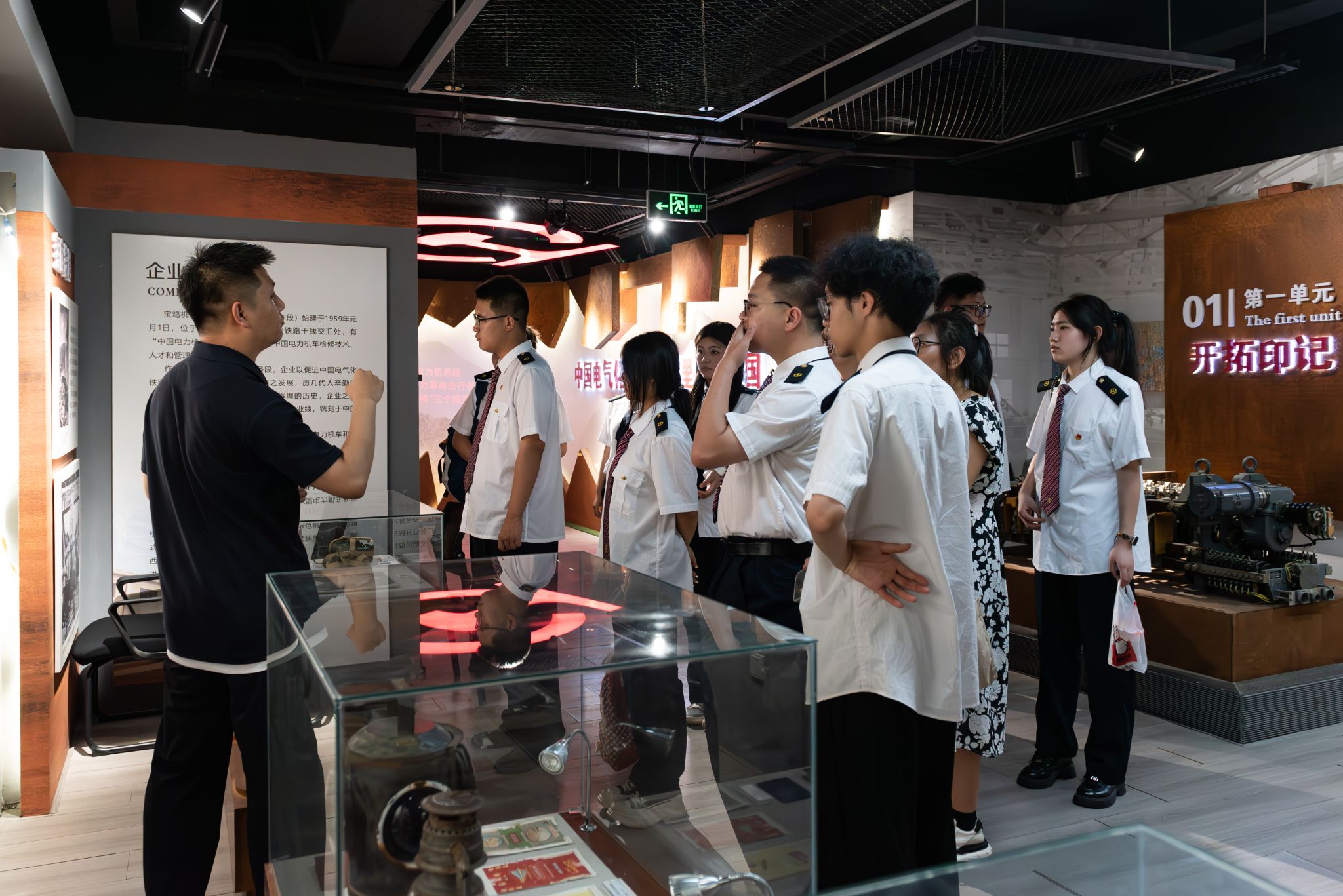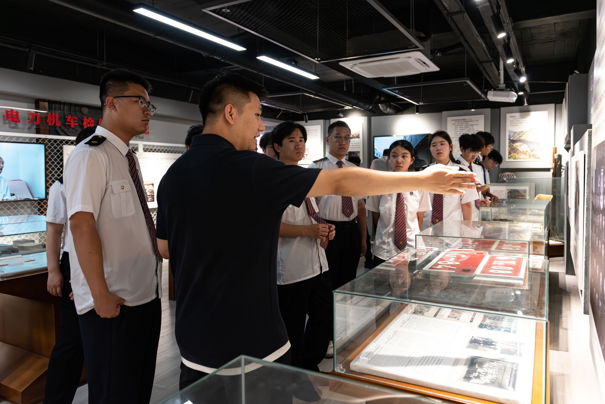 在工作人员的引领下,学生们首先来到厂史馆。馆内丰富的老物件、老照片以及详实的文字资料,生动地展现了宝鸡机车检修厂60余年的光辉历程,也勾勒出中国电气化铁路的发展脉络。从1962年打破西方国家技术封锁,成功完成中国首台进口6Y2电力机车中修任务,到如今运用智能化设备进行高效检修,每一个故事、每一项成就都深深吸引着学生们,让他们真切感受到老一辈铁路人“不怕苦、不服输、不含糊”的宝成精神。学生们认真聆听,不时提出问题,与讲解员积极互动,现场学习氛围浓厚。