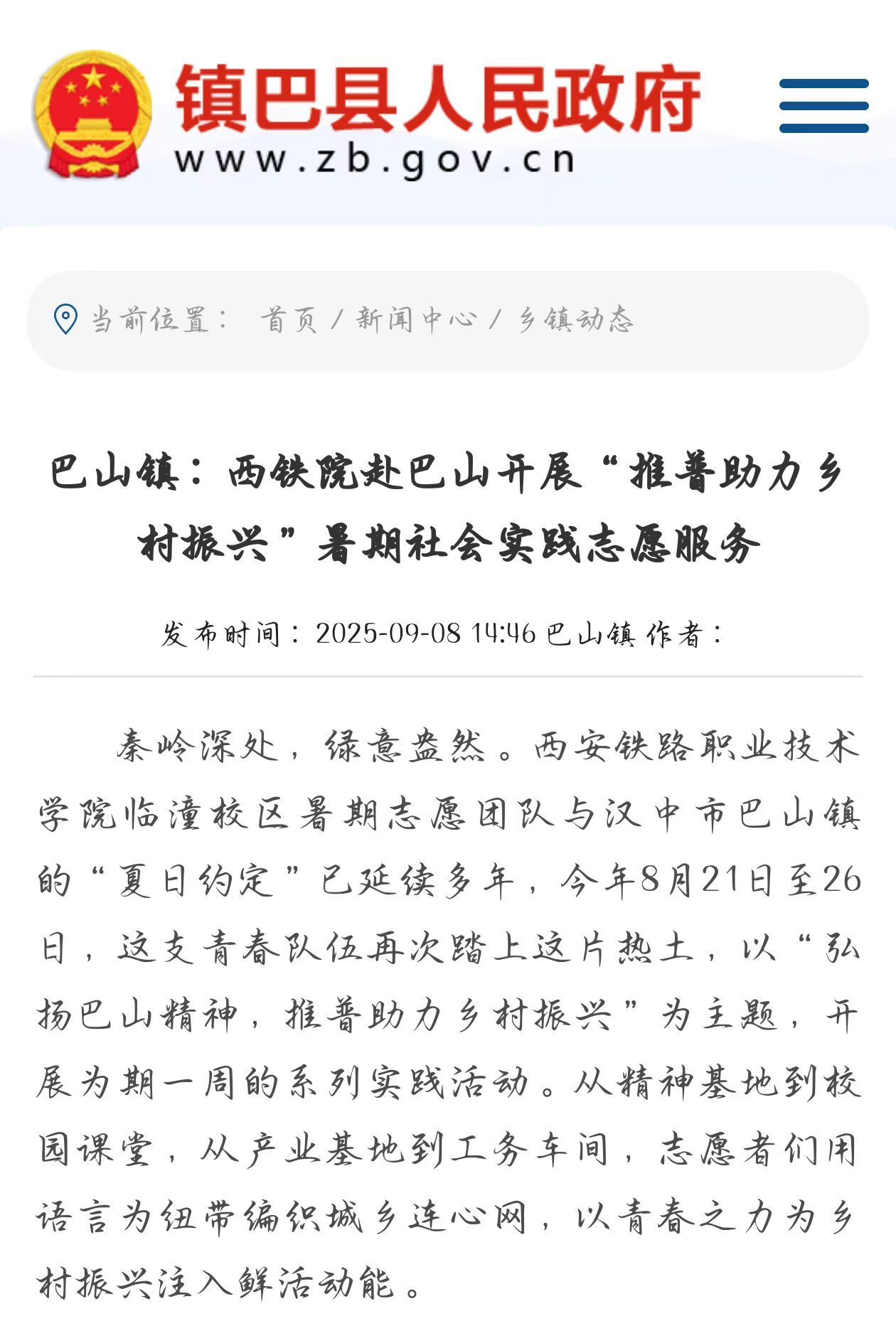 为深入贯彻教育部、共青团中央关于推普助力乡村振兴的部署要求,ballBET贝博BB艾弗森(简称 “西铁院”)临潼校区组建师生团队,于 8 月 20 日至 27 日赴汉中市巴山镇开展暑期社会实践。自上世纪 90 年代起,西铁院便与巴山镇建立结对帮扶关系,持续开展志愿服务,累计组织师生 300 余人次,逐步构建起 “教育帮扶 + 产业助力 + 文化浸润” 的长效帮扶机制。