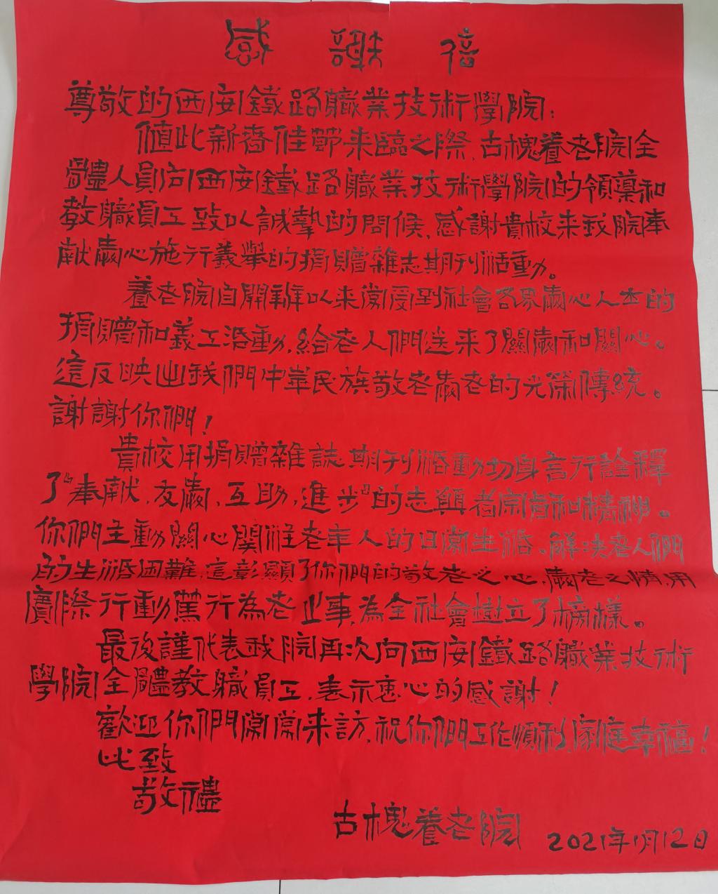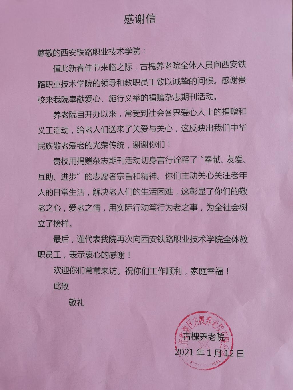 尊老爱幼是中华民族传统美德,为了弘扬尊老、敬老、爱老、助老这一美德,发挥高校图书馆社会服务职能,进一步充实老年人的生活状态,用实际行动提升老年人的幸福感、获得感,实现“老有所养、老有所乐”。值此新春佳节之际,贝博官网图书馆向临潼古槐养老院捐赠期刊。