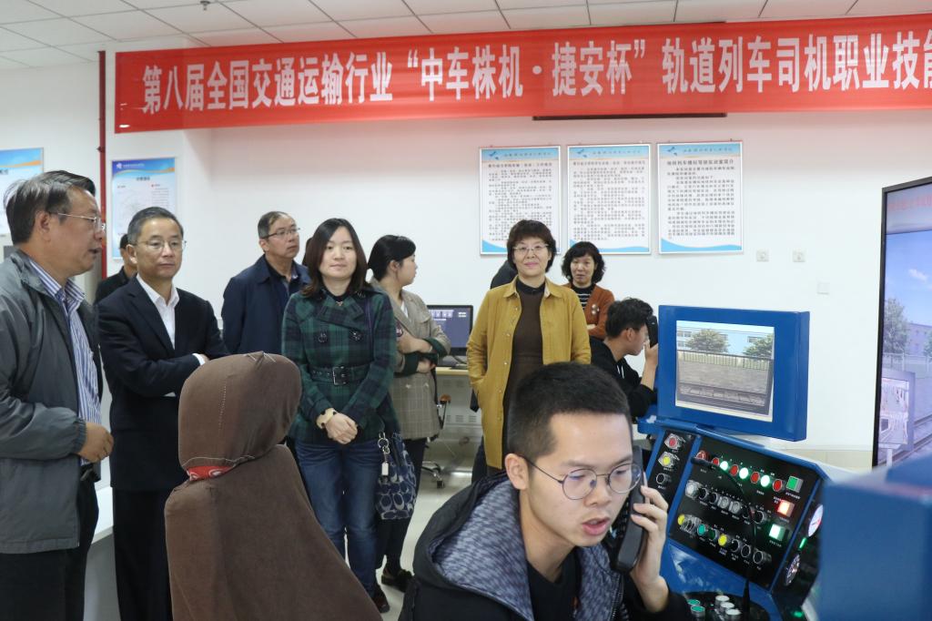 在李益民带领下,合肥地铁公司领导一行分别参观了牵引动力学院实训中心的SS4B和SS8型机车模拟驾驶实训室、机车车钩自检自修实训室、CCB-II型电空制动机实训室、机车乘务员一次乘务作业实训室、CRH380AL动车组模拟驾驶实训室、城轨车辆模拟驾驶实训室、城轨车辆电器实训室、城轨车辆牵引与制动实训室、城轨车辆电路板检测实训室、城轨车辆转向架实训室等,观摩了贝博官网学生进行的地铁模拟驾驶演示,同时城轨车辆教研室主任郝湘路还就贝博官网日前刚顺利验收的2018年重点建设项目“城轨车辆检查作业仿真演练系统”部分功能进行了展示。