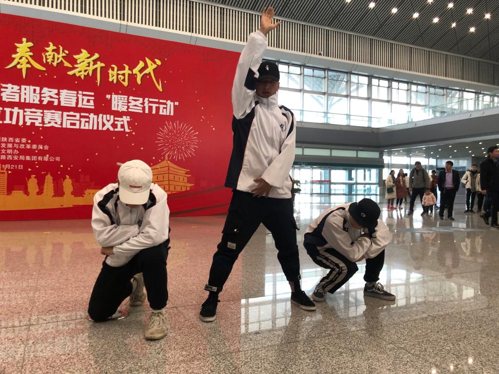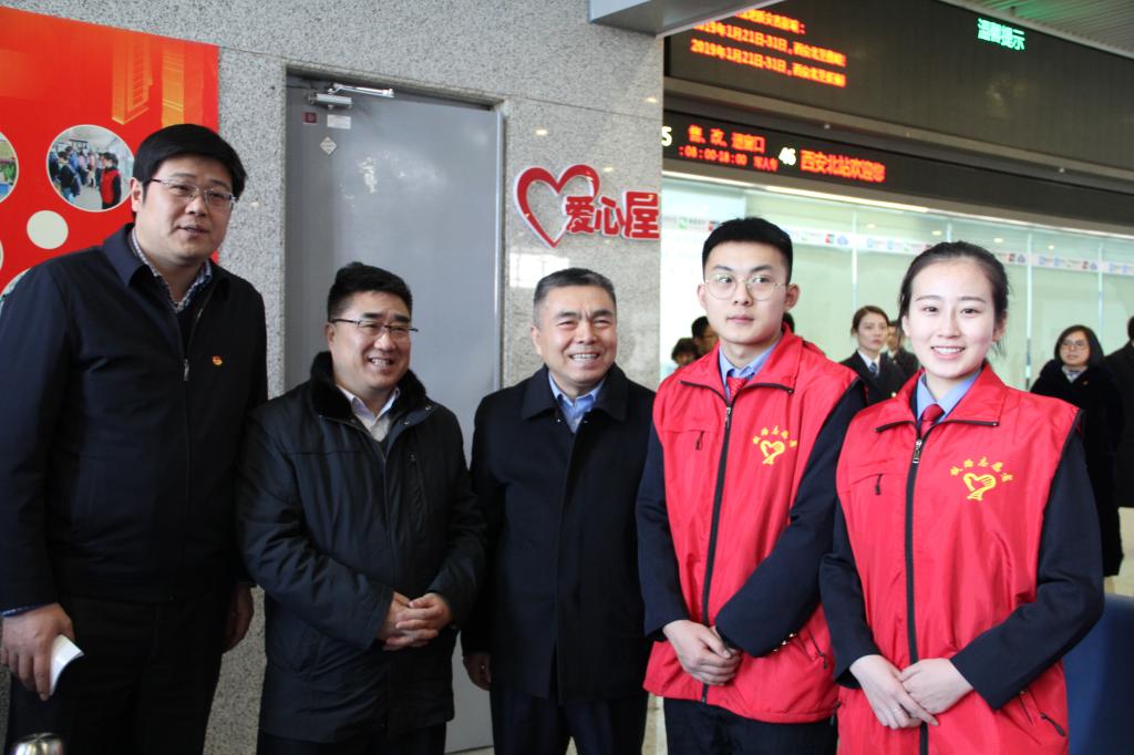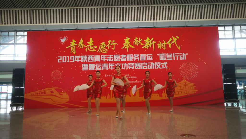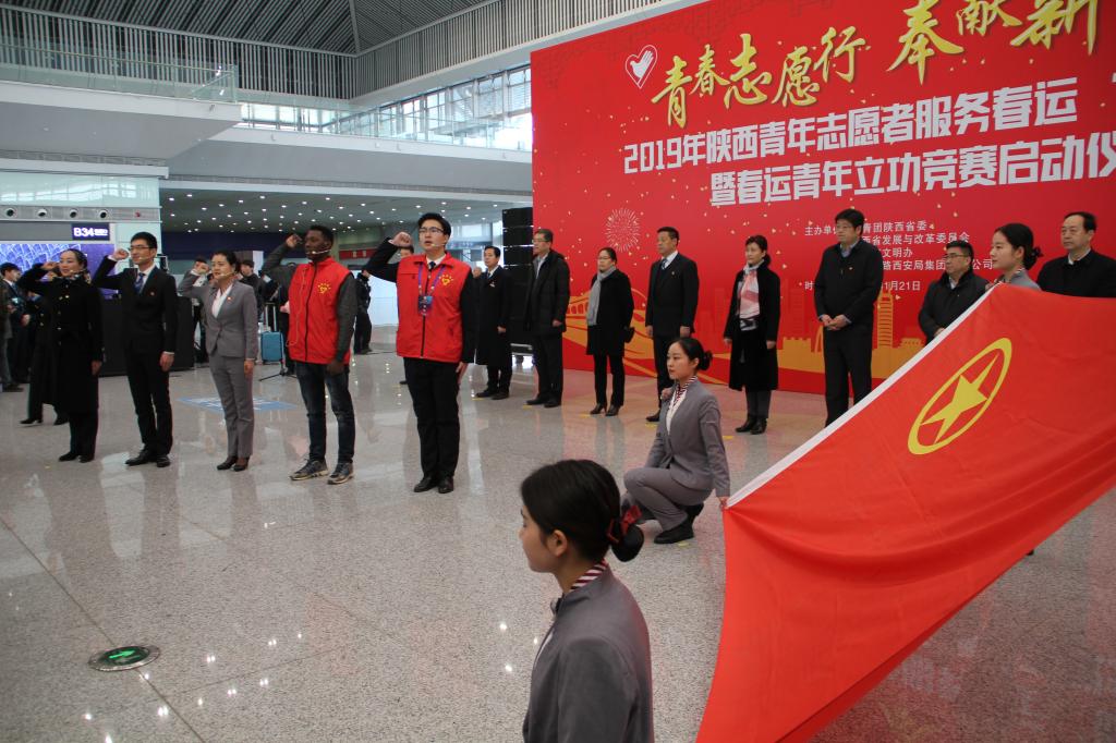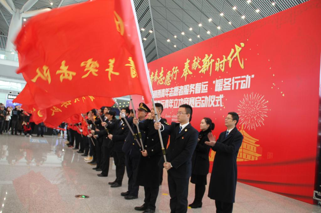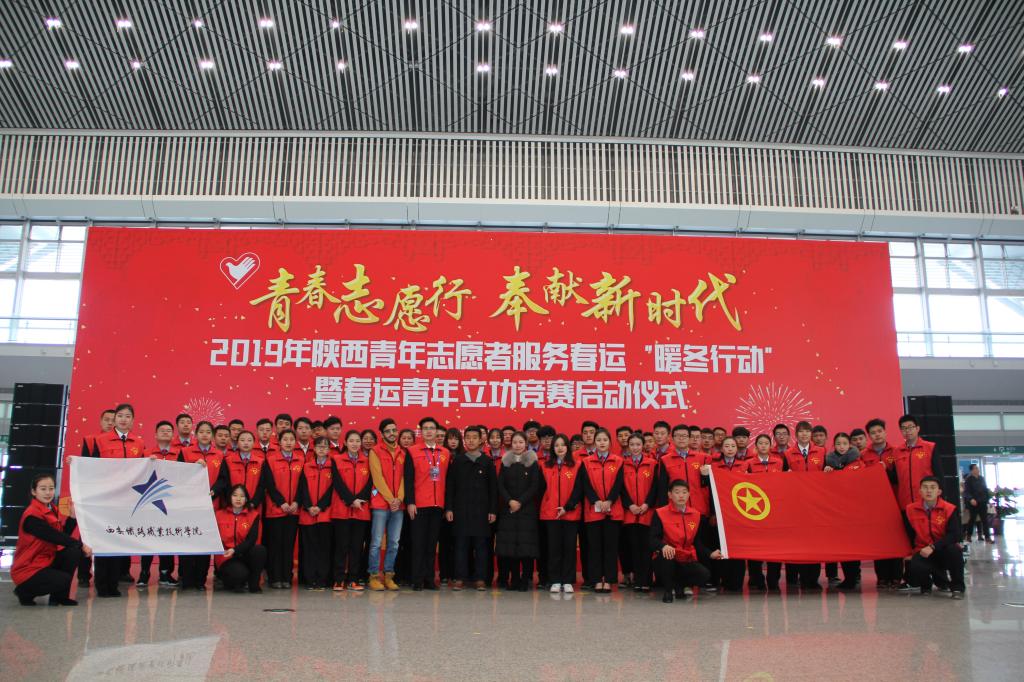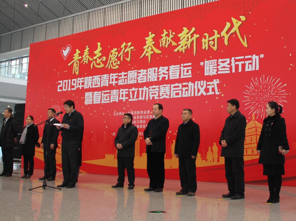 1月21日上午,由共青团陕西省委、省发改委、省文明办、中国铁路西安局集团有限公司等单位共同举办的“2019年陕西青年志愿者服务春运‘暖冬行动’”暨春运青年立功竞赛启动仪式在西安北站二楼候车大厅隆重举行。共青团陕西省委副书记、党组成员鲁镇,中国铁路西安局集团有限公司党委副书记、副董事长杨修昌,贝博官网党委副书记、纪委书记黄家昌,西安地铁有限公司团委书记李铁军等来自高校、地铁、公路、机场等系统的相关领导及300名青年志愿者代表出席了启动仪式。贝博官网团委副书记张治平、团委老师与贝博官网参与此次“暖冬行动”的四支队伍——西安北站服务队、西安站服务队、汉中站服务队和西安地铁服务队的共160余名春运志愿者参加了此次活动。