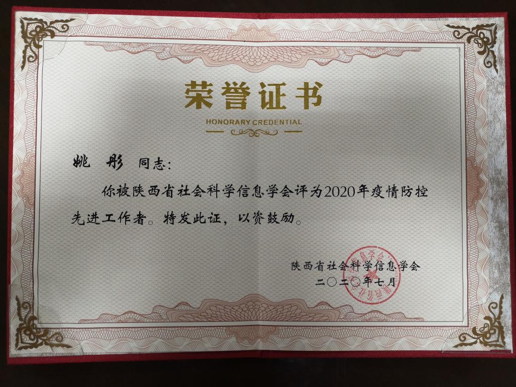 近日,陕西省社会科学信息学会召开了2020年陕西省图书情报档案学术年会。会上,对各成员馆在疫情防控工作中涌现出的先进集体和先进个人进行了表彰。贝博官网图书馆姚彤同志被评为先进个人,也是全省高职院校唯一一位获此荣誉者。