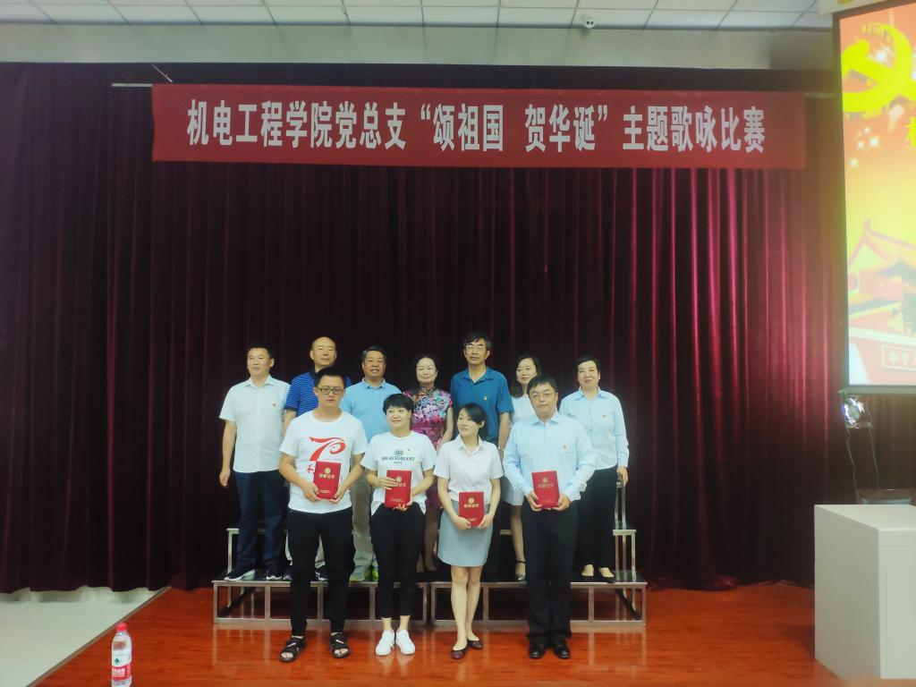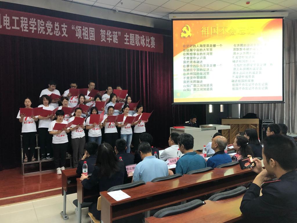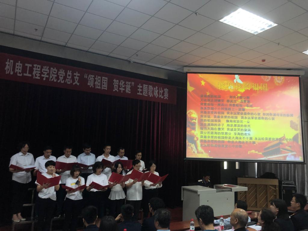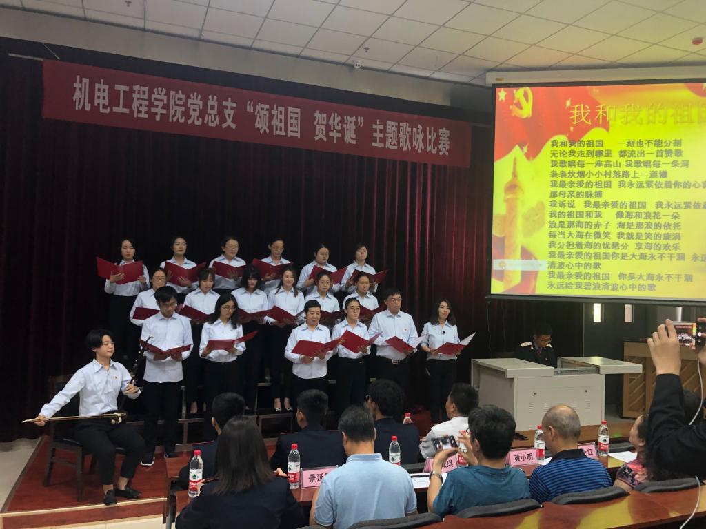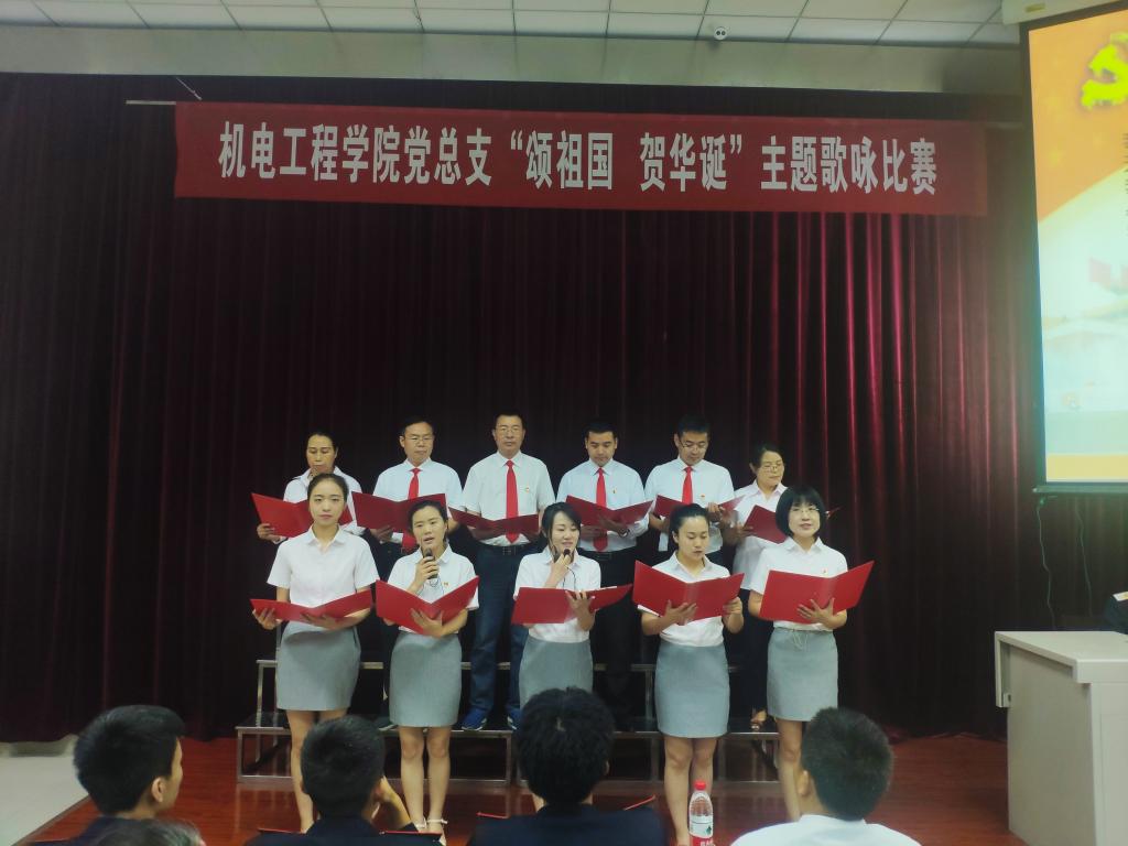 为庆祝中国共产党成立98华诞,迎接建国70周年。激发全院教职工爱党、爱国热情。增强“四个意识”、坚定“四个自信”、做到“两个维护”。 7月4日上午,机电工程学院党总支在一楼阶梯教室举行了“颂祖国,贺华诞”主题歌咏比赛。出席本次活动的领导有党委宣传部部长张家琪、现教中心主任黄小明、思政教科部主任景延鹏和教务处副处长史艺红。机电工程学院全体教职工及部分学生共200余人参加活动。