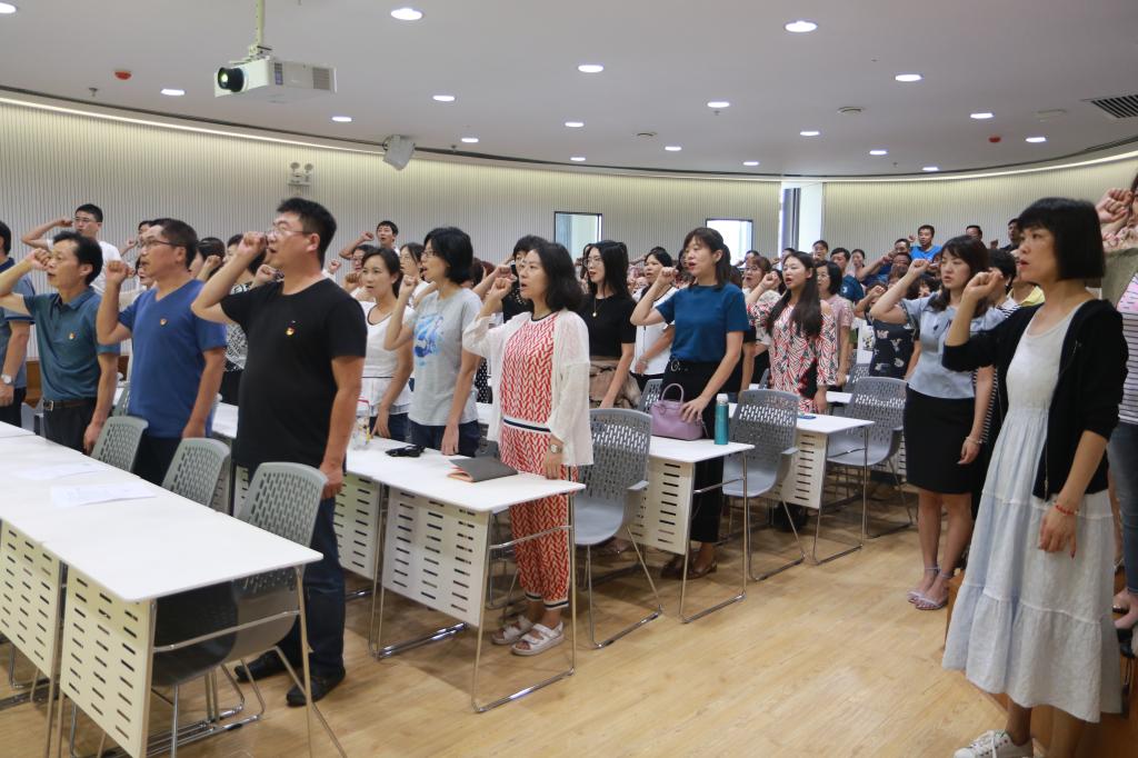 下午2点,教师齐聚国际交流中心,队列整齐,仪态端庄,场面庄严肃穆。宣誓活动由思政教科部主任景延鹏同志领誓,广大教师右手举拳,面对国旗庄严宣誓,高声诵读誓词,气氛隆重、热烈,广大教师深受感染。