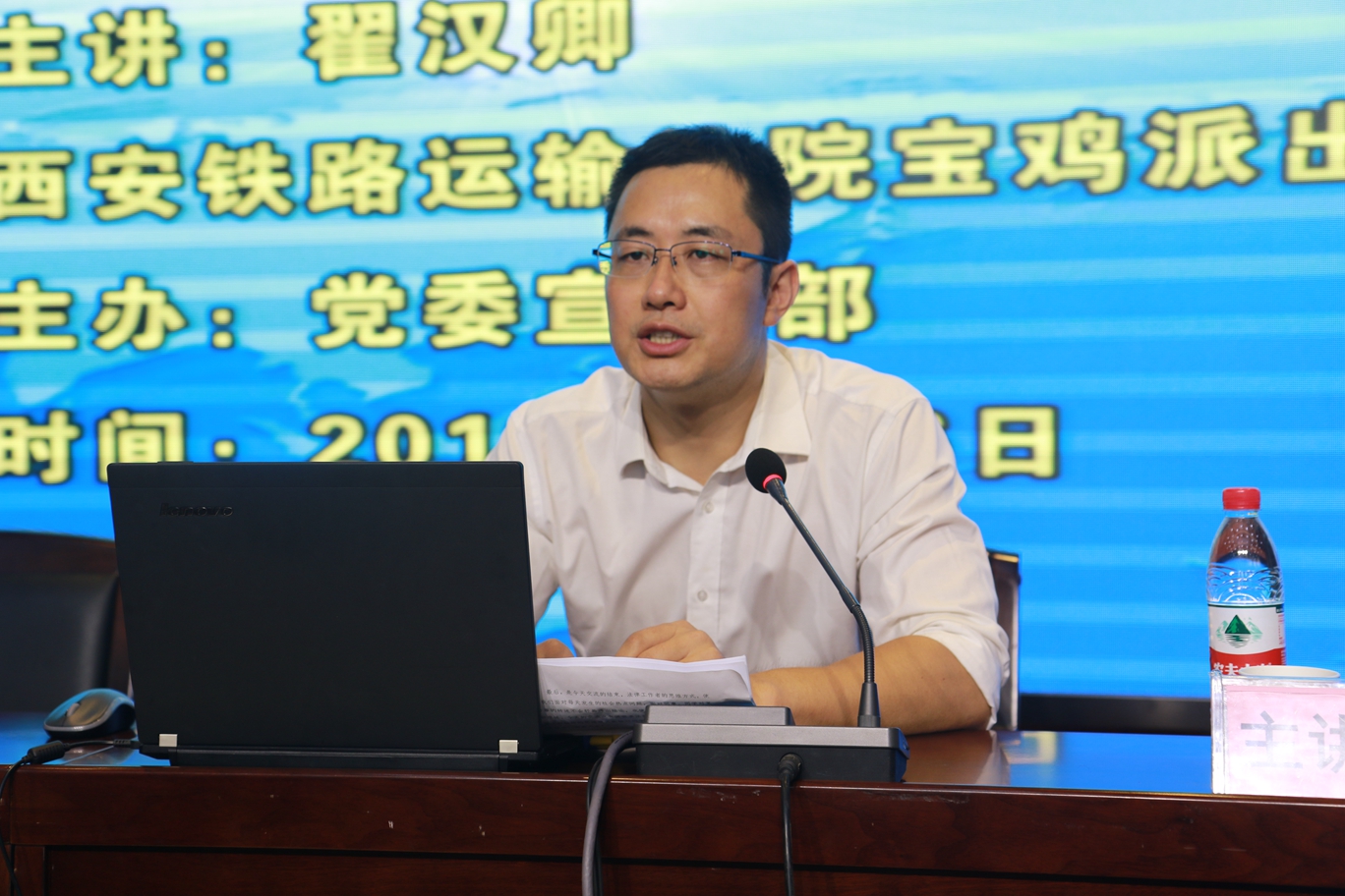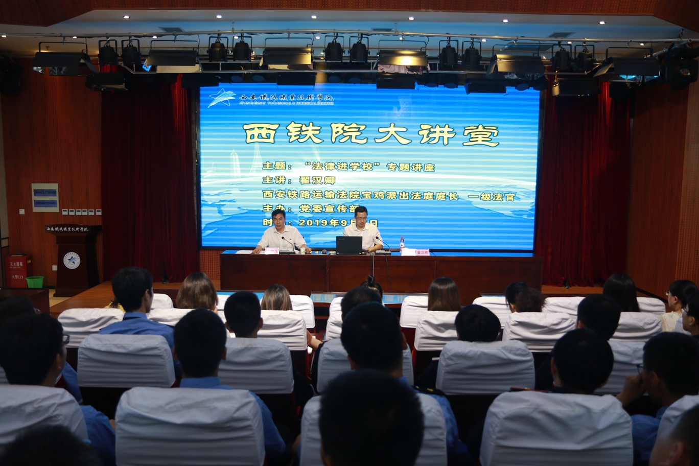 9月6日,西安铁路运输法院宝鸡派出法庭庭长,一级法官翟汉卿来到ballBET贝博BB艾弗森港务校区,为学院百余名师生带来了一场别开生面的法治专题讲座,学院党委宣传部部长张家琪主持讲座。