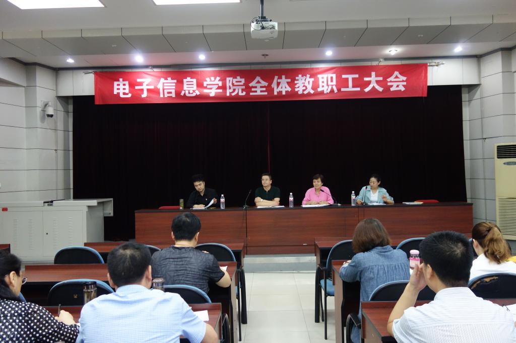 电子信息学院教职工大会不仅明确了新学期重点工作也提出了更高要求,全体教职工继续发扬追求卓越,自强不息的精神,合力攻坚,努力实现新的跨越。