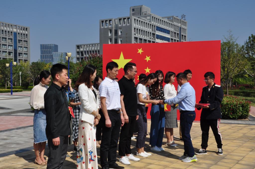 在宣誓仪式后,景延鹏一一向教师赠送国旗,希望大家能在国庆期间将国旗悬挂在自己家中,表达思政教师对祖国真挚的祝福。