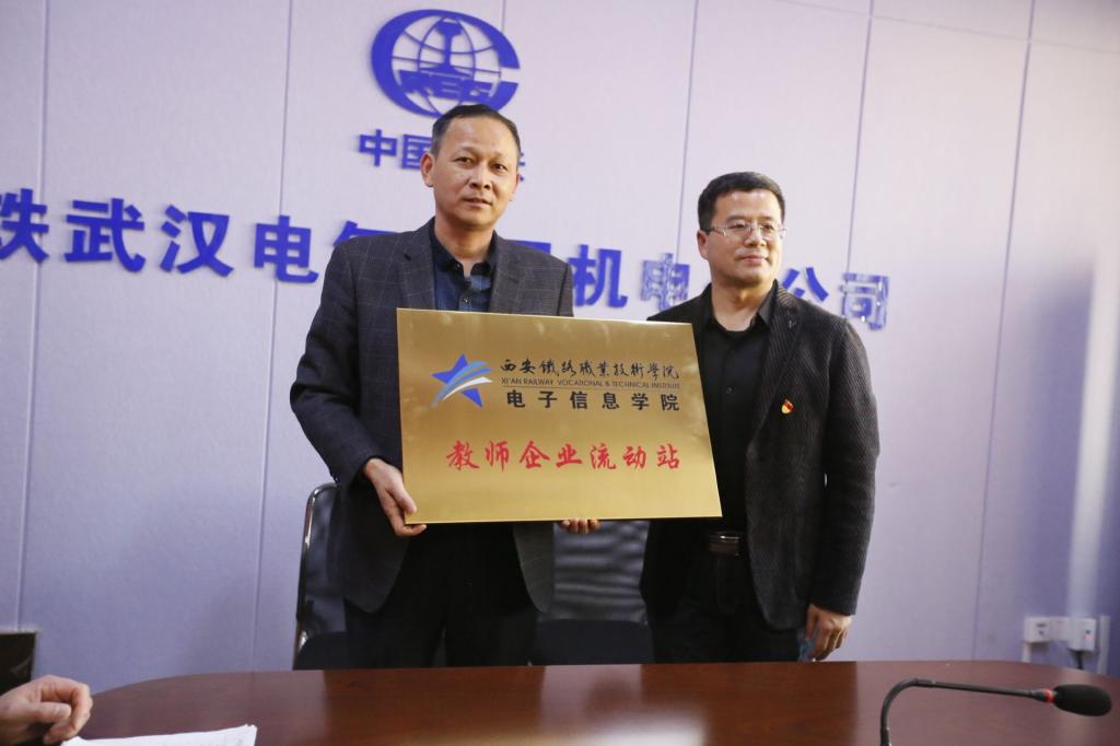 仪式上,双方签订了校企共建“产教融合实训基地”协议书。在热烈的掌声中张伟敏向中铁武汉机电分公司授“教师企业流动站”牌;耿高鹏向电子信息学院授“职工培训基地”牌。