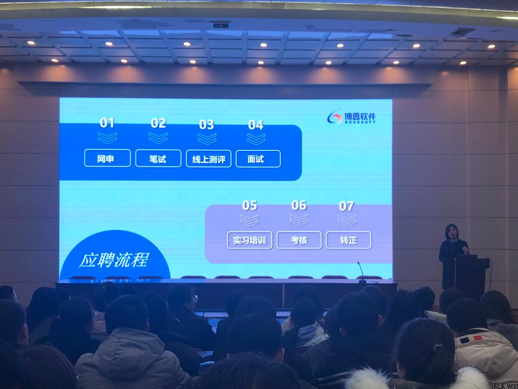博思软件公司作为深交所的上市企业,主要业务是为政府部门、事业单位提供财政信息化管理及服务。企业宣讲环节,博思公司陕西分公司的HR张道华首先介绍了博思公司业务体系:“三个业务板块构建两个系统+两朵云”。随后讲解了的应聘流程,以及目前所需要的人才类型,主要包括省级分公司实施工程师(全国)、软件工程设计师、软件测试工程师(福州、北京)等工作岗位,并对岗位职责和任职要求作出了明确的解释和要求。另外根据同学们的需求,张总也分享了职业发展的双通道,即普通员工到骨干员工,技术性人才和管理型人才的联系与差异,学生表示受益匪浅,不仅获得了面试的经验,也增加了对企业的了解,提升了求职的成功率。