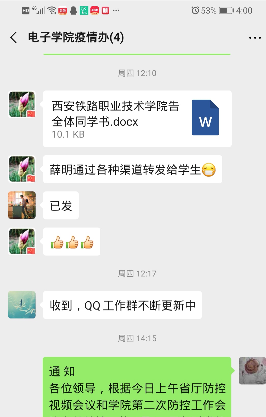 由于当前疫情的特殊性,又恰逢寒假,电子信息学院学工办迅速动员,全体辅导员班主任积极行动,通过班级微信群、QQ群、电话等途径,以各班级为单位持续开展全面严密排查,以师生健康状况日打卡的形式开展信息登记,从“外出经历、是否途径湖北武汉、有无与武汉籍人员有过密切接触、有无出现发热、咳嗽、呼吸困难”等进行每日信息报送,监督师生做好体温检测,从外地乘公共交通工具返回的人员主动上报在家隔离观察。学生工作党支部薛明书记带领党员每天总和信息、统计资料,切实发挥先锋模范作用,做到信息准确准时报送。为做好报送工作,辅导员班主任每天通过“一对一联系”,关心学生状况,询问学生情况,深夜凌晨都在收集整理信息,只为信息完整无误。党员老师们通过电话、短信、微信等多种渠道,引导师生克服麻痹思想,做好自我保护,非特殊原因不外出,不去人员聚集场所,不参加聚集性活动,不串门,不聚餐。