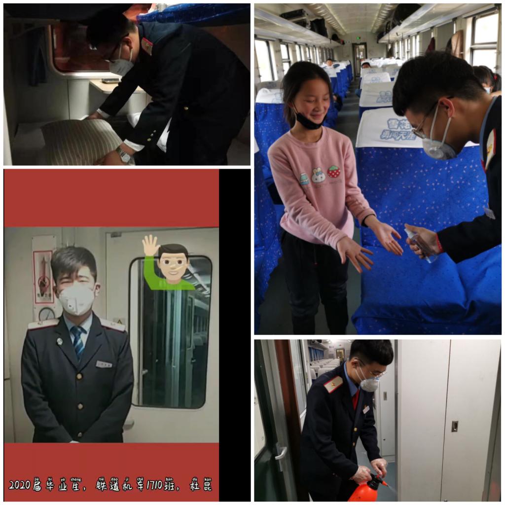 疫情爆发之后,在西安铁路局客运段广深车队实习生,牵引动力学院2017级做好铁道机车专业马资博、樊卓健和津连车队实习的杜昆等同学,在大年三十的晚上,在阖家欢聚的时刻,仍然坚守岗位,自觉扛起防疫抗疫的责任,奋力保证乘客的出行安全。