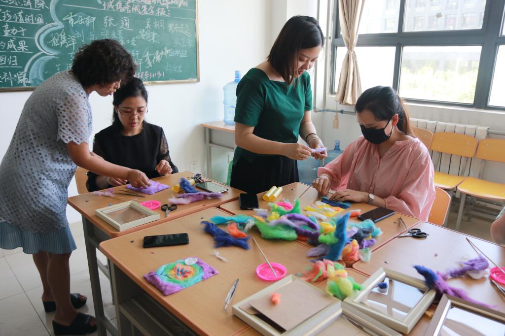 面花和棉絮画传统技艺体验环节,将本次非遗传承体验活动推向高潮,在活动现场,两位传承人以代表作品为例,介绍了所传承非遗项目的悠久历史和制作工艺。按照分组,传承人对本组的参与老师当面传授祖传技艺。在场老师踊跃参加,短短的功夫,色彩艳丽的棉絮在老师们手中变成绚烂的夏花,不同颜色的面团变成蝴蝶、花朵。老师们热情高涨,在传承人的指导下亲自动手体验,收获了自己的作品,更收获了创作的欢愉,感受到中国传统文化的魅力。