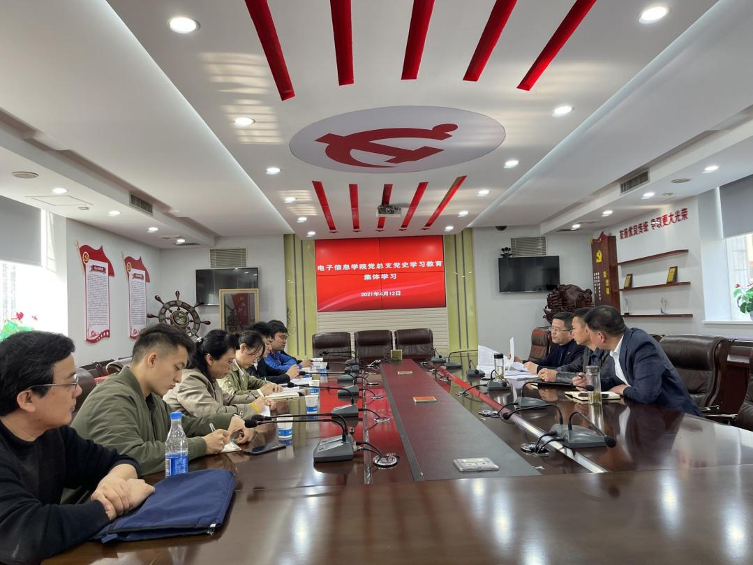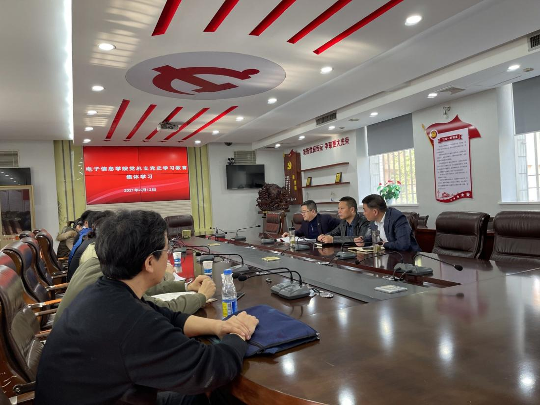 自学院党史学习教育开展以来,电子信息学院党总支对标对表学院党委理论学习中心组党史学习教育专题学习安排和处级以上干部读书班集中学习安排,积极组织,认真落实,于4月12日下午在第三会议室召开党史教育学习暨本年度第二次二级学院理论集体学习,党总支成员、各支部书记参加集体学习会。