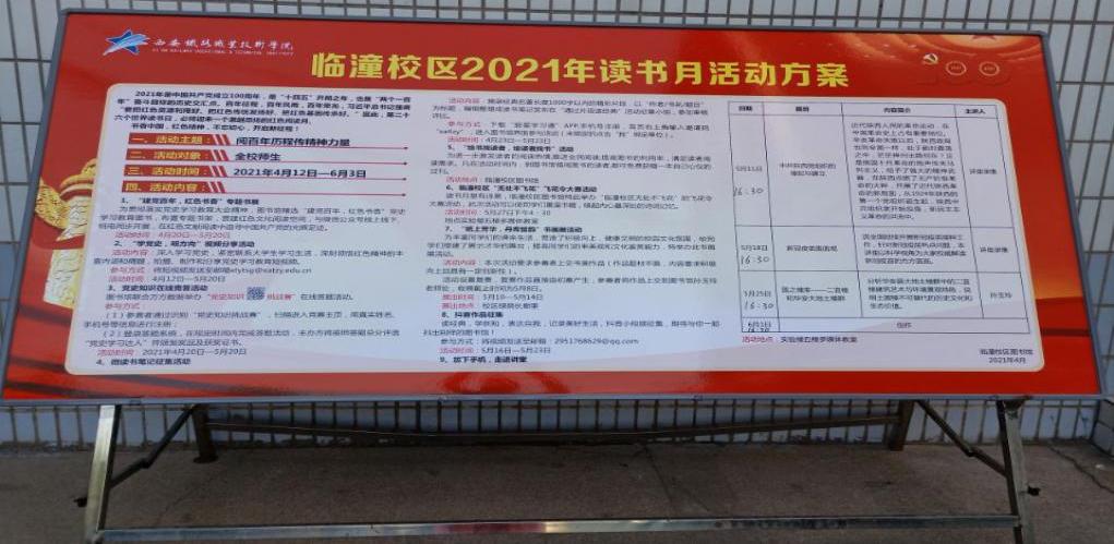 近期,临潼校区开展的2021年“庆祝建党百年”读书月活动已圆满结束。历时2个月的系列教育和读书活动,点燃了师生们的阅读热情,增强了文化自信感,引导广大师生继承与发扬中国优秀传统文化和红色文化,营造了浓厚的校园文化氛围。