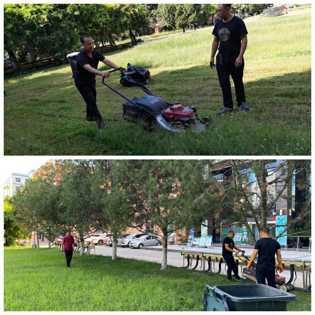今年雨水较多,校园草坪的草长势旺盛,每隔一段时间就必须修剪。从9月13日开始,总务科水工班、维修班和电工班全部职工在工余,利用休息时间,大家纷纷自觉加入到除草队伍行列中,划分责任区,你追我赶,逐步将校园草坪修剪完成。在修剪工作中,他们争先恐后,带上各类除草工具进入校园绿草坪,冒着秋老虎的余威,挥洒汗水,各展绝技,,艳阳下他们撸起袖子加油干,无畏炎炎烈日,精心将除草工作做到极致。有的推割草机进行杂草清除,有的将车里的杂草倒进垃圾桶,有的用垃圾桶将杂草清运至垃圾台,有的用剪刀剪枯树枝,他们分工明确,配合默契,草坪迅速变得平整,割草机的使用也越用越熟练。