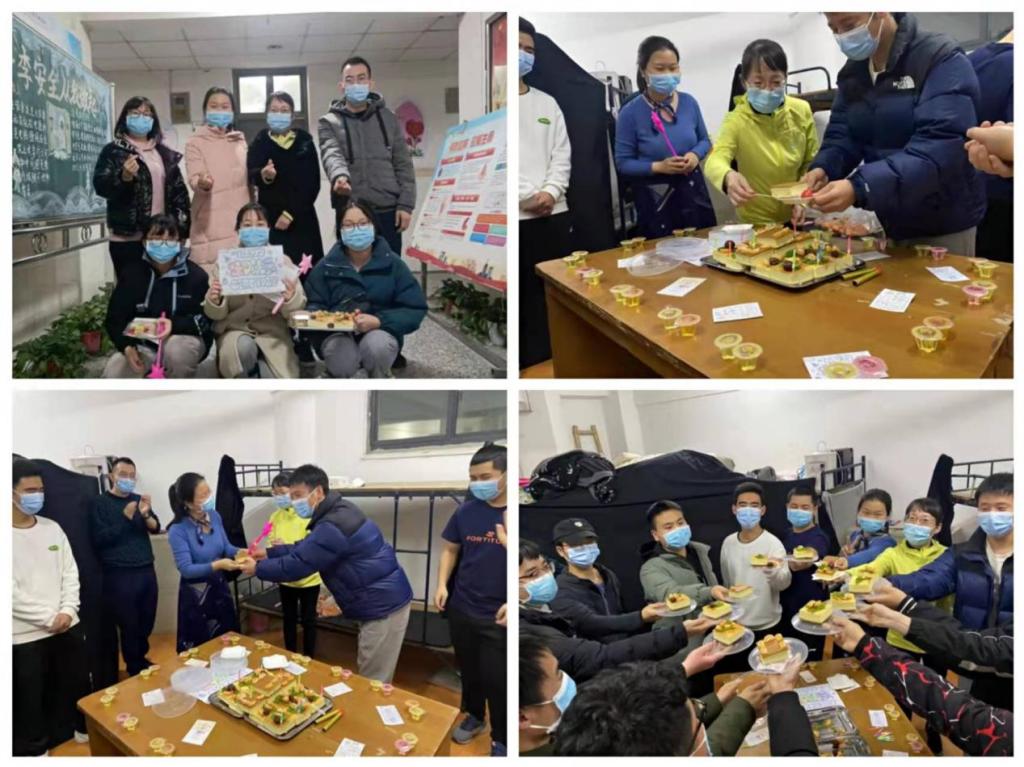 活动分楼层进行,男生4号公寓从二楼、三楼(一、二、三楼的寿星集中在三楼)、四楼、五楼、六楼,以及女生公寓的二楼大厅。当老师们笑意盈盈地送上一块生日蛋糕,代表团团圆圆、甜甜蜜蜜,再送上一个橙子,代表诚心诚意的爱和心想事成的美好祝愿。