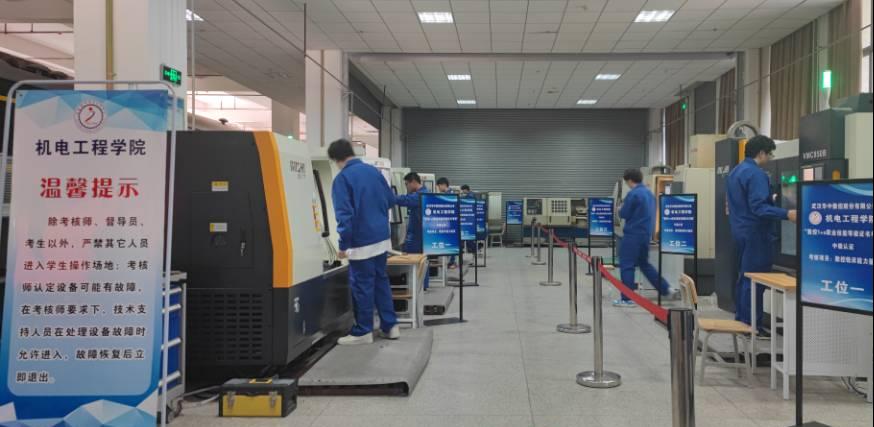 为确保考核认证工作顺利进行,智能制造技术教研室主任,考务负责人冯小庭带领团队全体教师,从人员选拔、培训模拟、场地布置、考务组织等环节,进行了充分筹备和训练指导。考核前期派专任教师赴武汉进行试点师资培训与考评员培训;成立专业教师辅导团队,利用课余和周末时间,组织考证学生进行为期1个月的强化训练,提升学生的实操技能;通过数控1+X职业等级证书理论考试云端系统,为学生提供在线练习和模拟测试的平台,有效提高学生的理论考试通过率;同时,专业教师为学生提供细致的考前指导,答疑解惑,有效保障了“1+X”证书考核任务顺利完成。