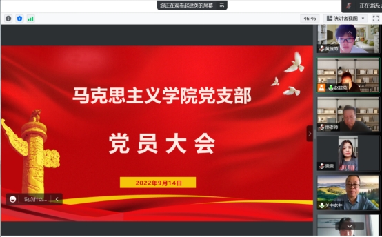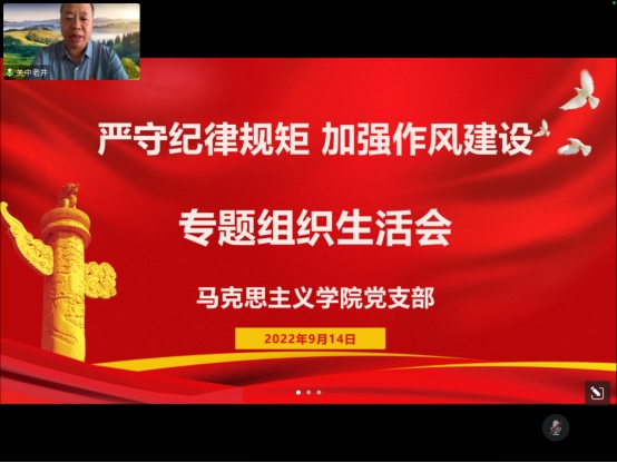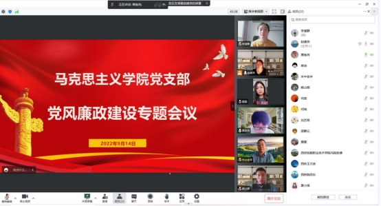 为进一步深化全面从严治党,加强纪律教育,强化作风建设,教育引导党员教师坚定信仰信念信心,不断增强政治定力和拒腐防变能力,切实增强政治担当、历史担当、责任担当,不断改进工作作风,按照学院要求,2022年9月14日下午,马克思主义学院党支部在腾讯会议上召开第五个纪律教育学习宣传月系列活动。会议由马克思主义学院党支部书记赵建英主持,22名教师党员全部参加。