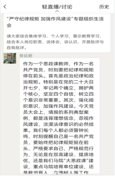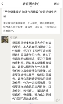 严格对照“勤快严实精细廉”,认真召开专题组织生活会。马克思主义学院党支部以“严守纪律规矩、加强作风建设”为主题,全体党员结合集体学习、个人自学、党规党纪知识测试等活动,以及岗位职责和履职尽责等个人实际情况,一一在“云班课”平台谈认识、谈体会,同时对照“勤快严实精细廉”标准,认真查摆自身在教育教学、师德师风、廉洁自律等方面存在的短板和不足,深刻剖析原因,并提出了进一步努力的方向和整改措施。