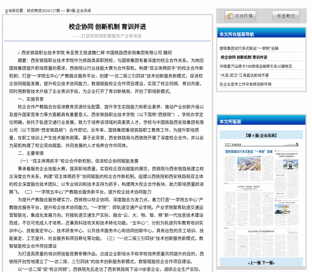 上一条:现代物流报:产教融合赋能铁路乘务岗位 ...