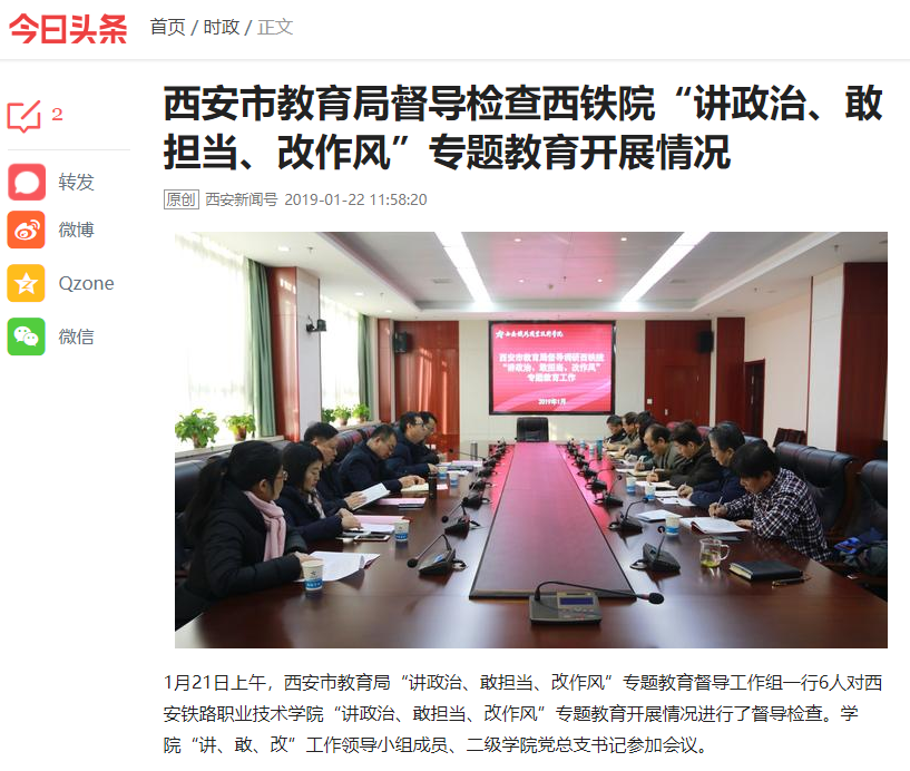 今日头条:西安市教育局督导检查西铁院“讲政治、敢担当、改作风”专题教育开展情况
