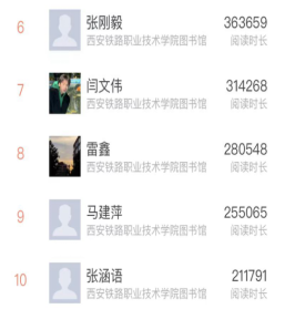 参与此次阅读打卡活动的师生共计236人,利用碎片时间坚持打卡超过20天,阅读打卡时长超过2000小时,赵博轩、柯伟、李鑫、樊瑞平、宋波涛、张刚毅、闫文伟、雷鑫、马建萍、张涵语等师生位列排行榜前10名,获得精美小礼品。师生们纷纷表示,坚持阅读打卡读书活动是一件有益的事情,既增长了见识,又开拓了思维,阅读成为每日的“第一课”,希望以后继续组织这样的活动,让阅读成为一种生活习惯。