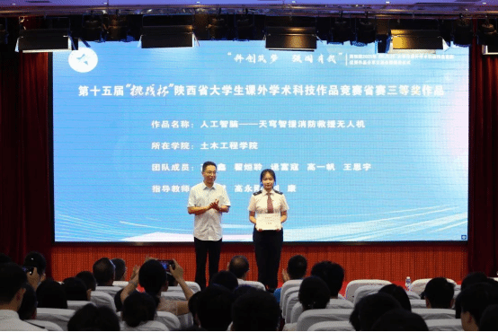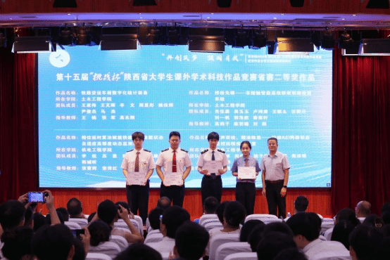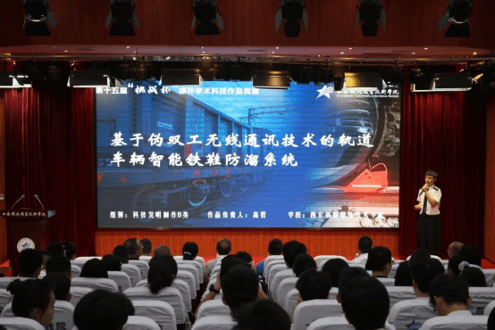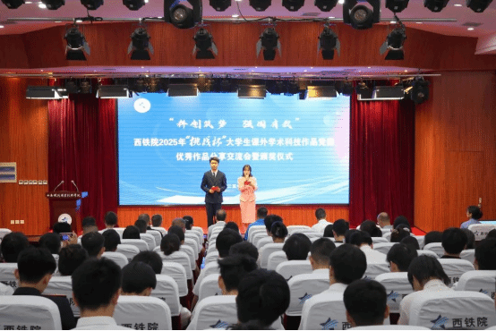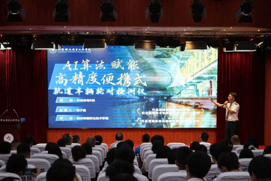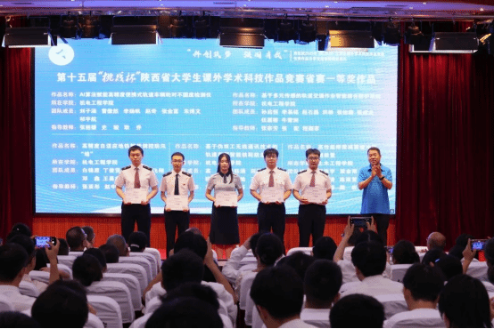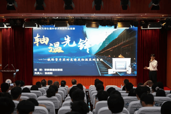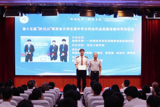 会上,师生一同观看本届竞赛回顾短片,重温本届竞赛历程,感受学院大学生的科创热情与奋斗足迹。学生代表朗诵《青春的挑战有我》,展现了学院学子敢于挑战、勇于创新的青春誓言。随后,荣获省级特等奖和一等奖的6件优秀作品团队代表进行现场展示,他们用扎实的研究、创新的思维和生动的讲述,呈现了一场精彩纷呈的学术盛宴。颁奖环节,任治军为获得省赛特等奖的学生团队代表颁奖,安学武为获得省赛一等奖的学生团队代表颁奖,张伟敏、王琛分别为获得省赛二、三等奖的学生团队代表颁奖。动车组检修技术2302班乔瑞翔同学代表获奖学生发言,现场分享了自己的参赛历程、备赛经验、参赛感悟与成长收获。