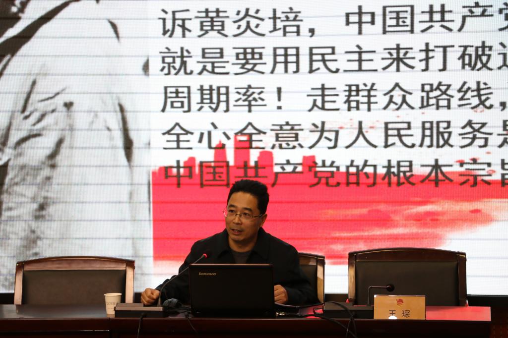 王琛首先向同学们介绍了井冈山精神、长征精神、西柏坡精神、两弹一星精神等红色革命精神,作为红色基因的精髓,是激励人们拼博奋进的强大精神支柱,也是中华民族精神的突出表现。讲解了毛泽东、周恩来等老一辈无产阶级革命家在延安开展土地革命、坚持抗日战争、领导和指挥解放战争并夺取全国胜利的光辉历程,阐释了延安精神的基本内涵,即延安精神是中国共产党创造的一种革命精神,主要内容包括:坚定正确的政治方向,解放思想、实事求是,全心全意为人民服务,和自力更生、艰苦奋斗。让同学们深刻理解了延安精神作为中国共产党的宝贵精神财富,是伟大中国精神的重要组成部分,是我们的传家宝。随后,王琛结合习近平总书记关于弘扬延安精神的重要论述,向同学们讲解了新时代大学生弘扬延安精神、传承红色基因的时代价值与重要意义。