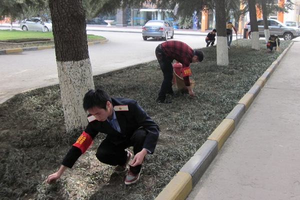 3月30日至31日,“百名校园雷锋阳光使者”所有志愿者统一佩戴袖标,对全院的草坪、后操场主席台两侧实训场地、体育器材室后面、操场东侧树林、男生一号公寓两侧、图书馆以及实训楼内等死角进行了彻底清扫和口香糖、乱贴乱画的清除。