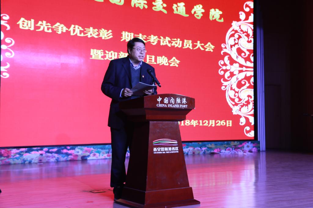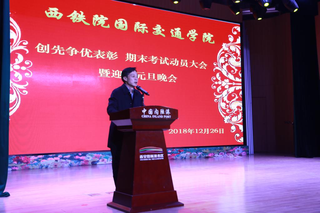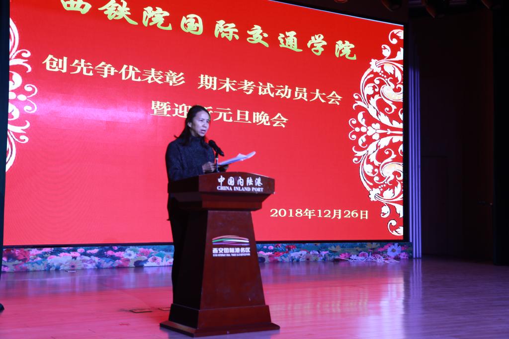 12月26日下午,由国际交通学院主办的“创先争优表彰 期末考试动员大会暨迎新元旦晚会”在西安国际港务区管理委员会2楼多功能厅举行。学院党委组织部部长任治军、宣传部部长张家琪、人事处处长赵西平、学生工作部部长郭小莉、副部长高阿联、院团委副书记张治平、国际交通学院院长赵景民、副院长韩发强及各二级学院党总支书记参加活动,国际交通学院全体师生共同到场观赏晚会,大会由韩发强主持。