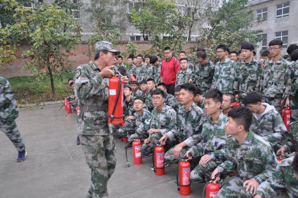 在灭火演练现场,军训教官为学生介绍了灭火器的正确使用方法,新生按照操作步骤分批次使用灭火器进行灭火演练,保卫干部在此过程中指导学生正确使用灭火器。