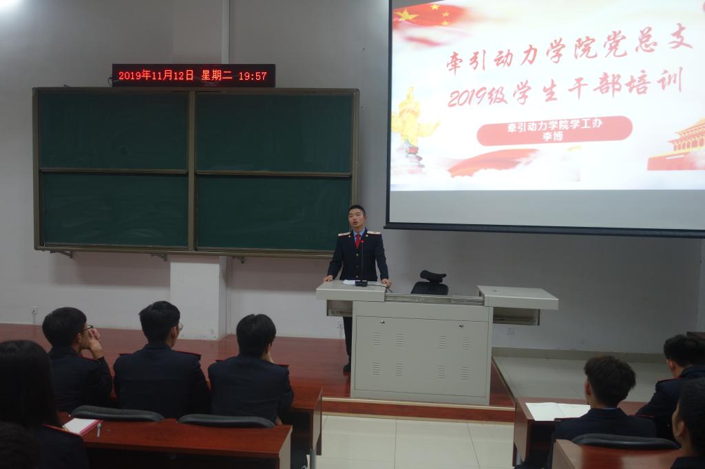 为了提高学生干部的思想认识,增强学生干部的综合素质和工作能力,更好的开展学生工作,11月12日,牵引动力学院党总支组织开展2019级学生干部培训。2019级班干部和学生支会学生干部200余人参加,培训由辅导员李博主持。