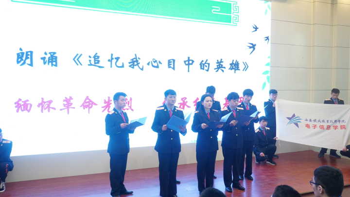 活动伊始,同学们共同观看了习近平追忆“闪亮的名字”,然后由学生代表李想为大家讲述清明节的典故、扫墓祭祖的优良东方孝道精神、革命战争年代为国捐躯的先进典型人物、新时代下为社会主义事业奉献生命的工作者们,这种舍小家,为国家的精神值得每一位广大青年去学习、去传承。紧接着,由朗诵社为大家带来诗歌朗诵《追忆我心目中的英雄》,一字一句、一平一仄寄托了同学们对革命烈士的缅怀和深刻悼念。活动最后进行了集体观影,观看了革命题材影片—《集结号》,没有流血就没有和平,没有牺牲就没有今天来之不易的幸福生活,革命烈士的事迹会幻化成永不磨灭的丰碑,高高矗立在后人心中,英雄儿女们的故事会成为激励每一名青年建功立业的精神。