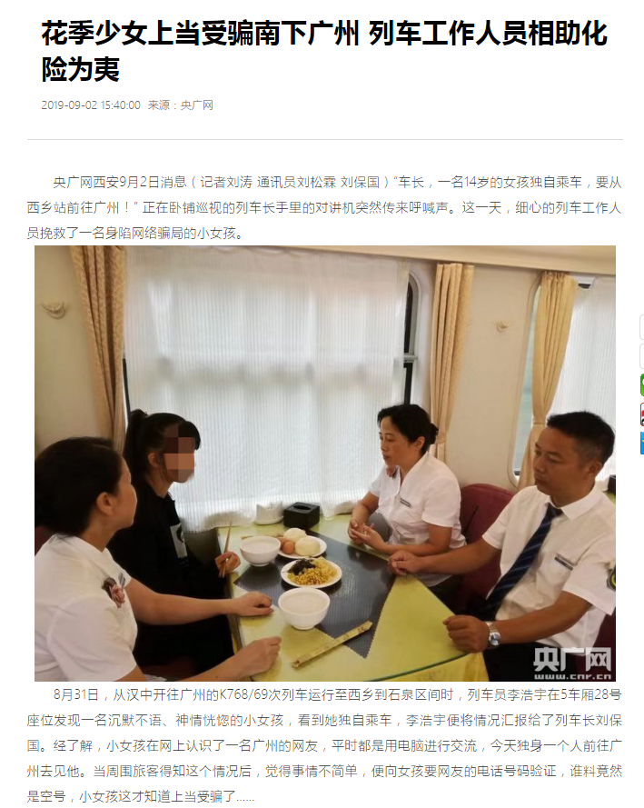 2019年8月31日,从汉中开往广州的K768/69次列车运行至西乡到石泉区间时,列车员李浩宇在5车厢28号座位发现一名沉默不语、神情恍惚的小女孩,看到她独自乘车,李浩宇便将情况汇报给了列车长刘保国。经了解,小女孩在网上认识了一名广州的网友,独身一个人前往广州去见他。经过仔细询问广州网友的情况,小女孩才发现上当受骗了……