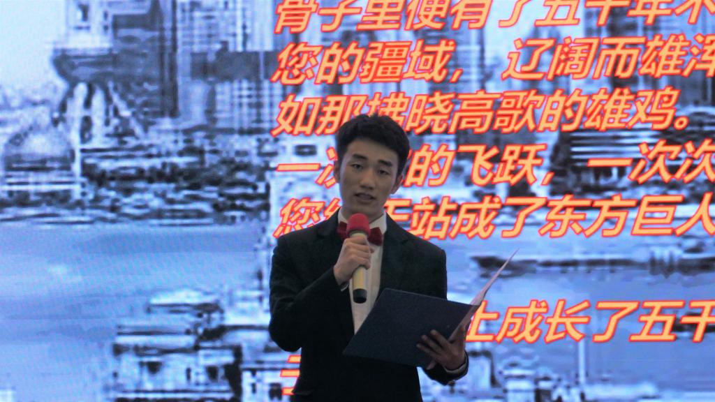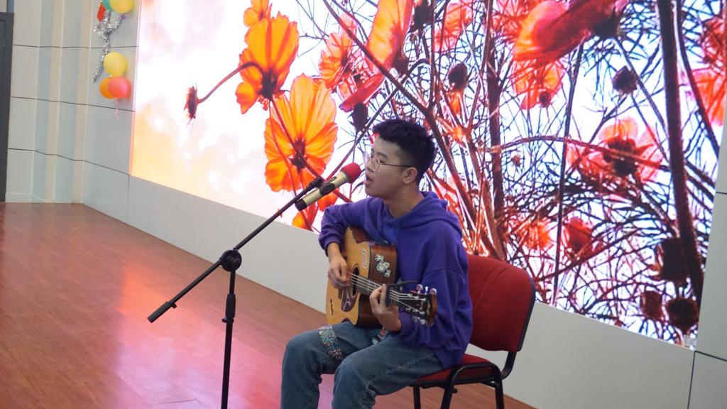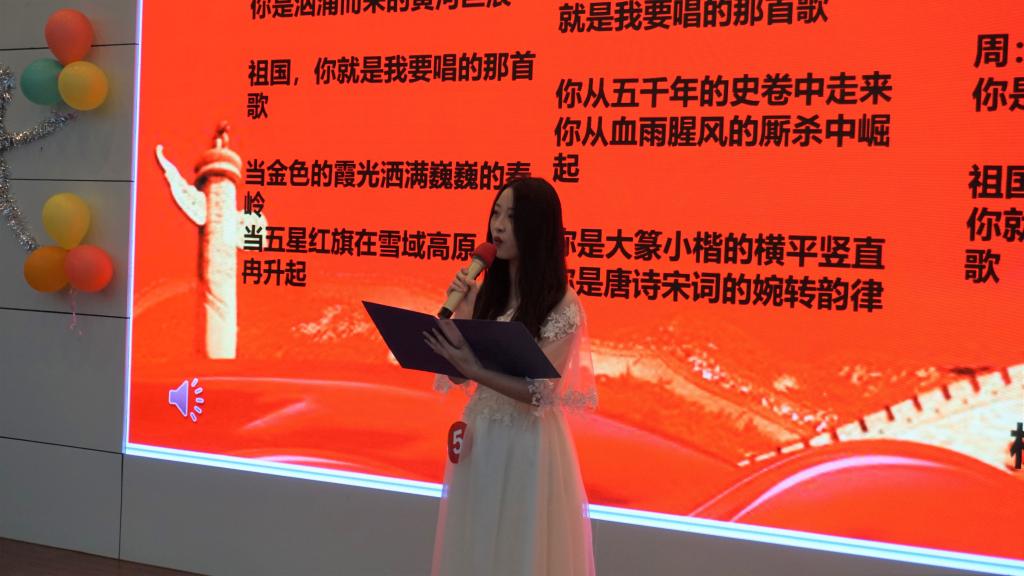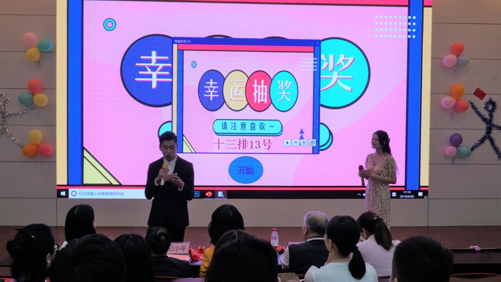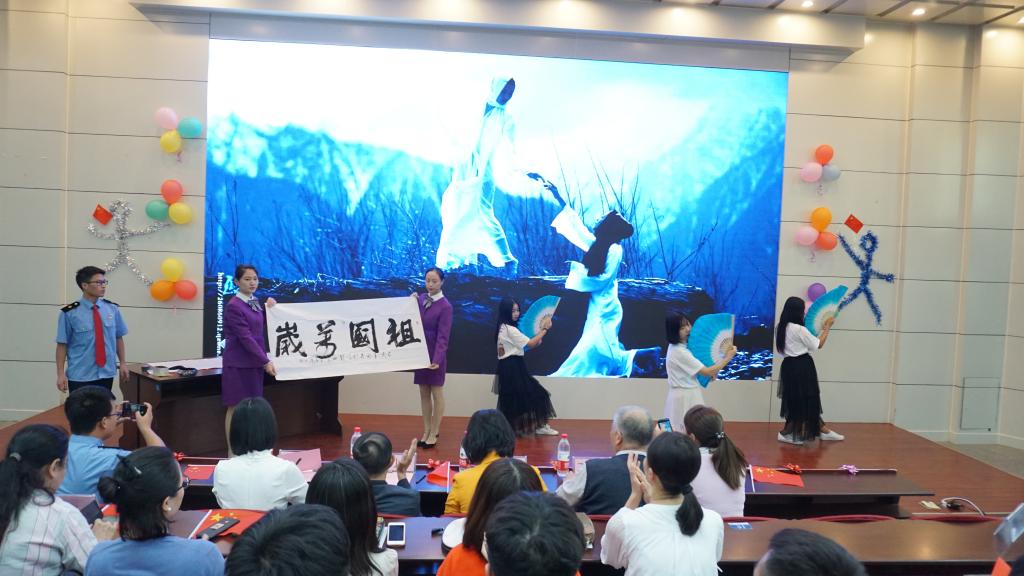 在串场中,电子信息学院带来了精彩的节目:书法舞蹈表演《归去来兮》和音乐弹唱《画》,同时设置了幸运观众抽奖、全场合唱《我和我的祖国》等环节。