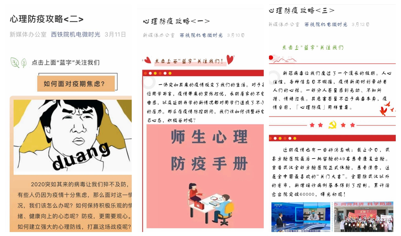 疫情防控线上志愿服务行动:学院青年志愿者通过线上的方式在便民服务、心理疏导、网络宣传等方面开展志愿服务,全力以赴协助参与疫情防控工作。