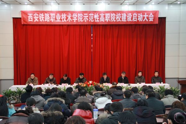 贝博官网于2011年1月12日在阶梯教室隆重召开了“西铁院省级示范院校建设启动大会”,陕西省教育厅高教处处长袁宁、原副巡视员刘豫川,西安市教育局副局长李忠良、学院党政领导以及贝博官网建设项目组全体成员、全院科级以上干部参加了示范院校建设启动大会。