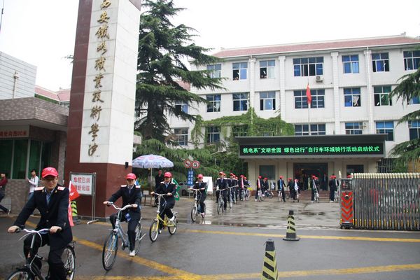 随着学生处长卢进安手中发令枪的一声清脆的响声,挂着宣传彩旗的自行车队伍从院本部出发开始骑行,途经环城路、东门、南门、钟楼、北大街、北门等地点历时2个小时最后返回学院。