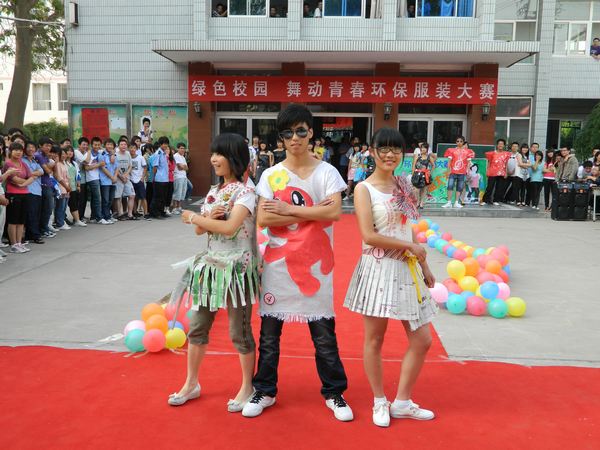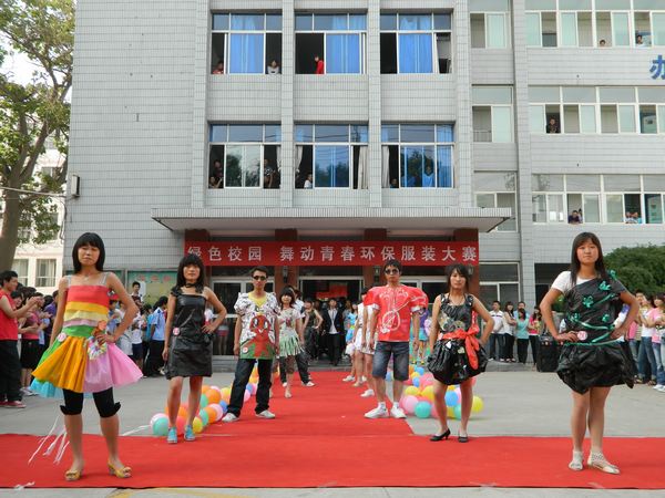 “绿色校园 舞动青春”环保服装大赛在教学楼前举行。 校区主任任治军、党总支书记贺错良、副主任赵景民、张国邦等观看了比赛。