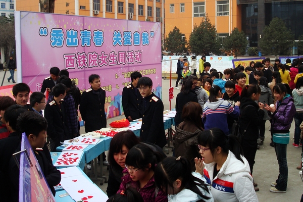 3月8日,院团委向全院男学生发出倡议,号召男学生为身边的女学生做一件力所能及的小事。14日,院团委在詹天佑广场开展了 “心随手动”手工作品展示活动、 “魅力女生”创意PHOTO秀和“ 星语心愿”许愿活动,吸引了近千名院本部学生参加,同学们踊跃投票,评选出心目中的“魅力女生”和优秀手工作品,并在许愿板上留下对家人的祝福和对学院及自身未来发展的期盼;在阶梯教室,院团委联合工会组织了200余名女学生听取了“女性健康保健知识”讲座。