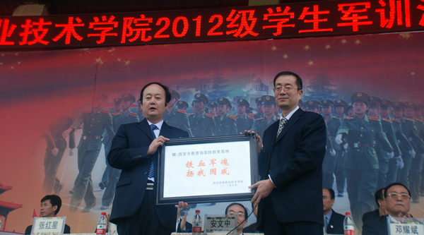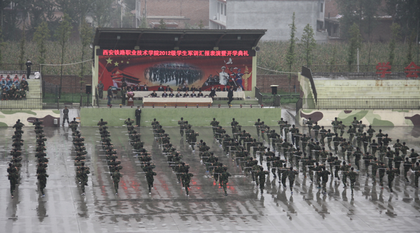 9月25日上午,贝博官网2012级新生军训汇演暨开学典礼在西安市教育局国防教育基地隆重举行。学院党委书记安文中、院长田和平、副院长邓耀斌、翁谦锁,西安市教育局国防教育基地书记韩新、基地主任张红星、基地副主任刘登毅及学院各系部处室负责人冒雨出席了大会,大会由龙首校区主任、本次军训学院总负责史艺农主持。