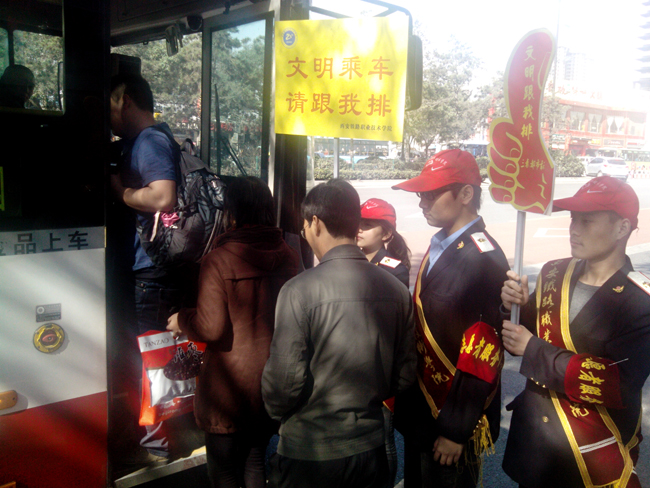 龙首校区始终贯彻以素质教育为中心,以社会实践活动为载体,培养同学们的组织能力、与人沟通能力、融入社会能力和服务社会的责任意识。多年来,校区师生积极响应市委、市政府、市文明办的号召,作为“跟我排”活动的积极践行单位之一,与“三秦都市报”共同倡导宣传“文明礼让 跟我排”活动。近四年来志愿者们长期坚持在人流较为密集的火车站、钟楼、北稍门等公交站点进行志愿服务,组织乘客有序排队乘车。