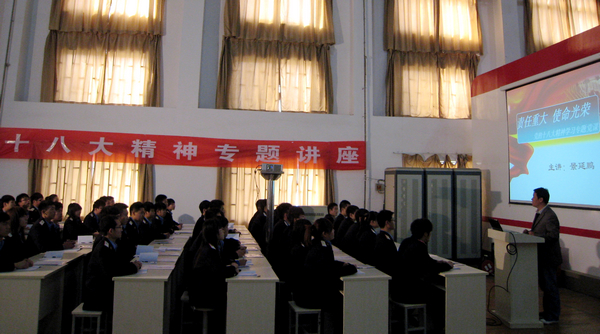11月28日,院团委组织品学兼优的学生团干、学生会干部、学生社团干部、学生党员和入党积极分子等学生骨干在轨道运营实训室进行了学习十八大精神集中学习活动,学院思政教科部主任景延鹏做了辅导讲座。