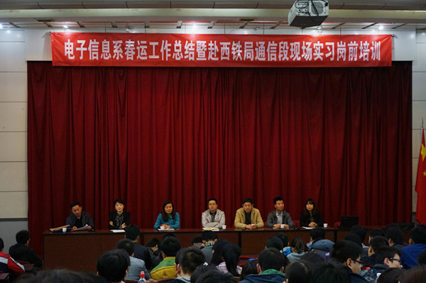 上午,电子信息系春运工作总结暨赴西安铁路局通信段现场实习岗前培训会议在阶梯教室召开。电子信息系主任孙津平、党总支书记张伟敏、通信技术教研室主任王超、西铁局通信段职教科长秦松荫、劳人科以及培训工程师出席会议,会议由系办副主任马荣主持。电子信息系198名西安铁路局签约学生参加了会议。