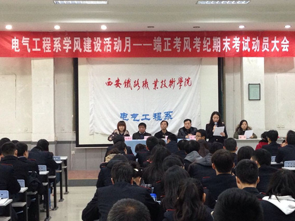 12月18日下午,电气工程系在教学楼三楼大自习室召开端正考风考纪及期末考试动员大会。系主任张刚毅、系党总支书记任建国及系办、学工办张秀红、马纪、董燕等老师和160余名学生干部参加了大会。